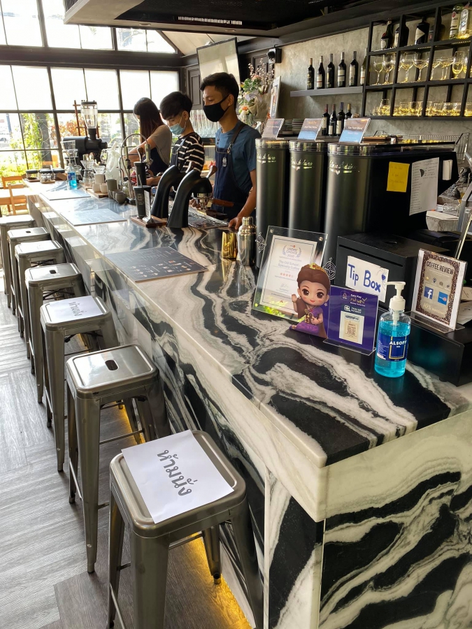 บรรยากาศของการนั่งทานที่ร้านกลับมาอีกครั้ง(New Normal) เราให้ความสำคัญกับความสะอาดบริเวณทั่วทุกจุดตลอดเวลา จัดที่เว้นระยะห่าง ความสะอาดของพนักงาน พนักงานสวมหน้ากากอนามัย และหมั่นล้างมือตลอดเวลา เราให้ความร่วมมือกับภาครัฐมาตลอดอย่างดี เรามีโซนที่นั่งดื่มภายในร้านและโซนด้านนอกที่มีอากาศถ่ายเททั่วถึง