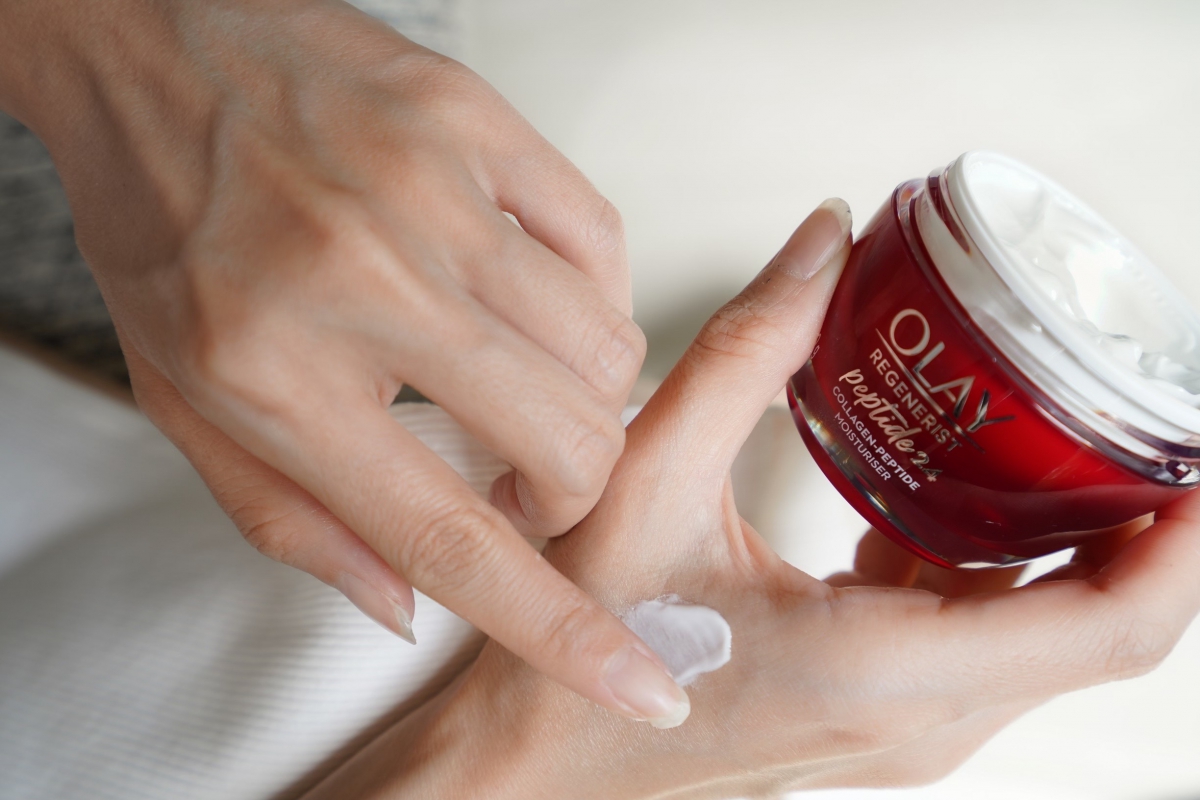สเต็ป 1 เริ่มต้นจากการปรับพื้นสภาพผิวด้วย Olay Regenerist Collagen-Peptide24 Serum (โอเลย์ รีเจนเนอรีส คอลลาเจน-เปปไทด์24 เซรั่ม) เพียงหยดเนื้อเซรั่มจากดรอปเปอร์มาประมาน 1-2 หยด พร้อมวอร์มบนหลังมือสักพัก ก่อนเกลี่ยเบาๆ ไปทั่วผิวหน้า เนื้อเซรั่มจะค่อยๆ ซึมซับเข้าสู่ผิวพร้อมเข้าบำรุงริ้วรอยให้แลดูเรียบเนียนขึ้นได้อย่างล้ำลึก