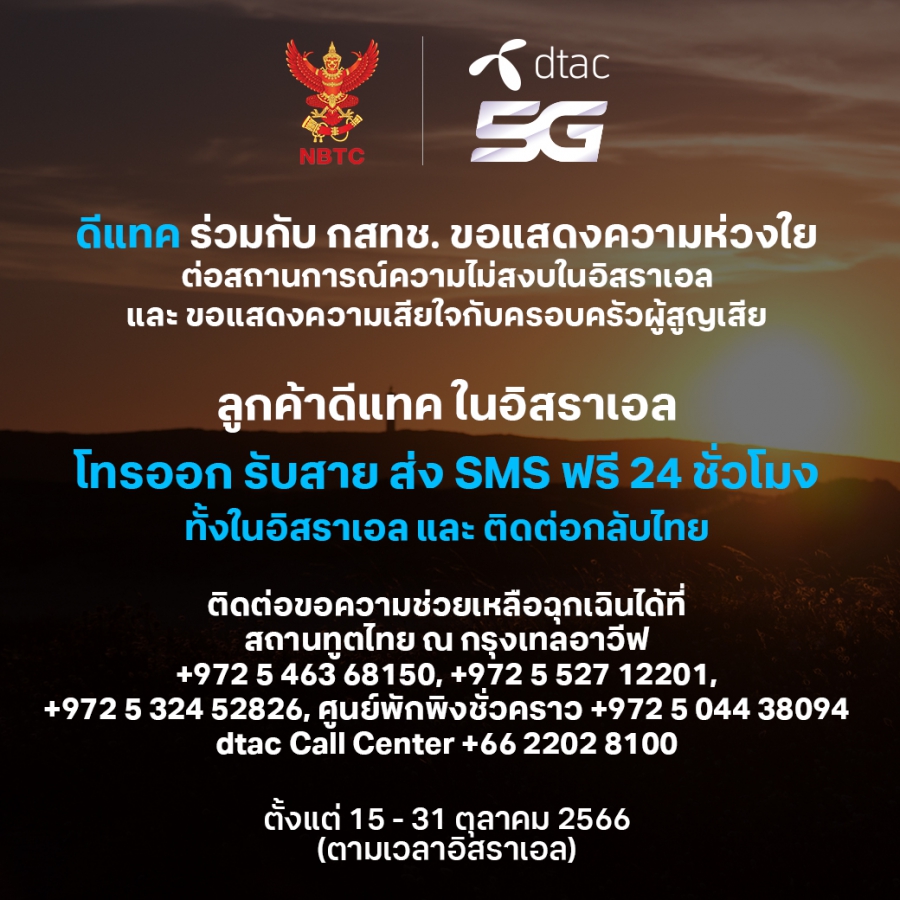 นายจักรกฤษณ์ อุไรรัตน์ (รักษาการ) หัวหน้าคณะผู้บริหารด้านกิจการองค์กร บมจ.ทรู คอร์ปอเรชั่น กล่าวว่า “ทรู คอร์ปอเรชั่น ขอแสดงความห่วงใยต่อสถานการณ์ความไม่สงบในอิสราเอลที่มีมาต่อเนื่อง โดยเฉพาะคนไทยที่พำนักอยู่ในพื้นที่ที่เกิดเหตุการณ์ดังกล่าว ทรู คอร์ปอเรชั่น ในฐานะผู้ให้บริการสื่อสารโทรคมนาคม ตระหนักเป็นอย่างดีว่ากำลังใจและการสื่อสารในสถานการณ์เช่นนี้เป็นสิ่งสำคัญที่สุด ที่ผ่านมาจึงอำนวยความสะดวกให้ลูกค้าทรูมูฟ เอช และดีแทคที่ใช้บริการโรมมิ่งอยู่ในอิสราเอล สามารถติดต่อสื่อสารและขอความช่วยเหลือฉุกเฉินจากสถานทูตไทย ณ กรุงเทลอาวีฟ และ Call Center ของทั้งทรูและดีแทคได้ฟรี ตั้งแต่ 7 ตุลาคมที่ผ่านมา รวมทั้งล่าสุด ยังได้ยกระดับการอำนวยความสะดวกในการติดต่อสื่อสาร โดยเปิดให้ลูกค้าทั้งทรูมูฟ เอช และดีแทค โทรออกและรับสายฟรีทั้งในอิสราเอล รวมทั้งติดต่อสื่อสารกลับมายังครอบครัวในประเทศไทย รวมทั้งส่ง SMS ได้ฟรี ตลอด 24 ชั่วโมง ตั้งแต่วันนี้ จนถึง 31 ตุลาคม 2566 และหากสถานการณ์ยังไม่เข้าสู่ภาวะปกติ ก็จะพิจารณาขยายเวลาอีกครั้ง”
