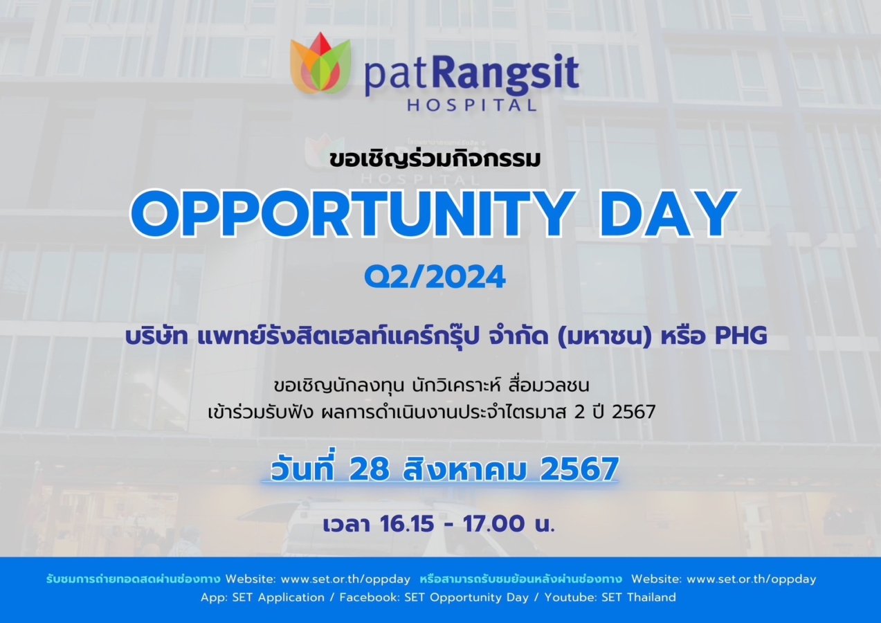 บมจ.แพทย์รังสิตเฮลท์แคร์กรุ๊ป หรือ PHG จัดเต็ม! พร้อมเปิดแผนธุรกิจ และกลยุทธ์การเติบโต ที่จะมาเล่าให้นักลงทุนฟังกันแบบจุกๆ ถึงโอกาสการเติบโตของธุรกิจ เอาเป็นว่า เคลียร์คิวให้ว่าง แล้วพบกันได้ที่งานบริษัทจดทะเบียนพบผู้ลงทุน หรือ Opportunity Day ในวันที่ 28 ส.ค.67 เวลา 16.15 น. ผ่าน 3 ช่องทาง คือ Website : set.or.th/oppday, Facebook: SET Opportunity Day, และ Youtube: SET Thailand บอกเลยห้ามพลาดเด็ดขาดนะคร้า