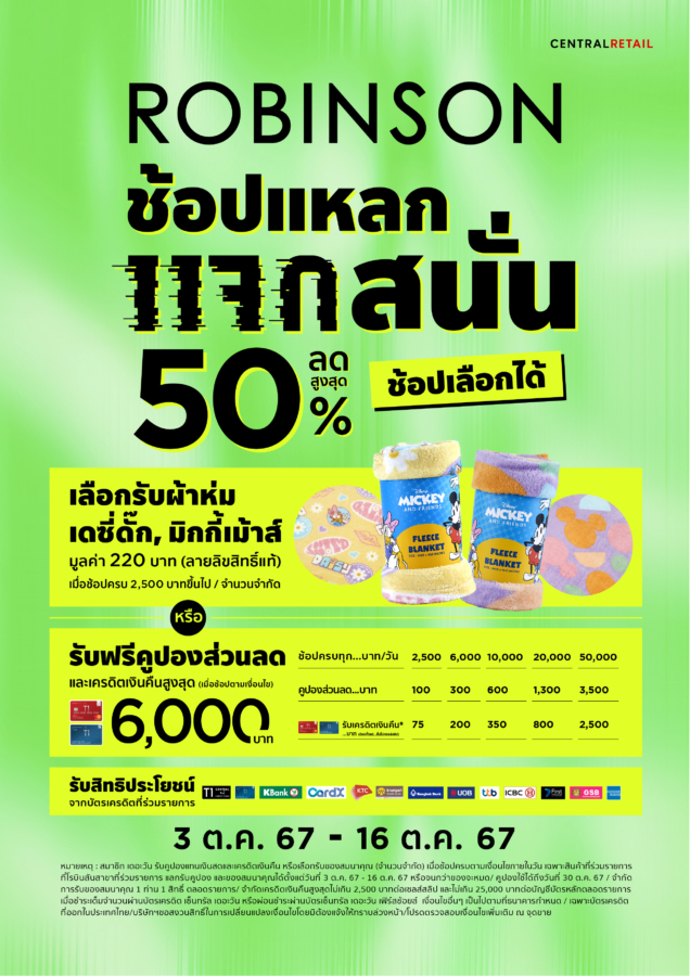 ช้อปเลือกได้ จอยทุกดีลกับแคมเปญ “ROBINSON ช้อปแหลก แจกสนั่น ครั้งที่ 2” ได้ตั้งแต่วันที่ 3 ต.ค. – 16 ต.ค. 67 ที่ ห้างโรบินสันทุกสาขา (ยกเว้นสาขาจังซีลอน) หรือช้อปผ่านหลากหลายช่องทางการช้อปปิ้งสุดสะดวกของห้างฯ ไม่ว่าจะเป็น Robinson Chat & Shop, Robinson Personal Shopper On Demand โทร.1425 ผู้ช่วยส่วนตัวสำหรับทุกคน Central App และเว็บไซต์ www.central.co.th ตลอด 24 ชั่วโมง รวมทั้ง Facebook Fanpage: Robinson Department Store