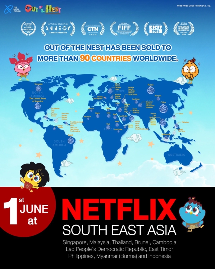 T&B Media Global (ประเทศไทย) นำแอนิเมชัน Out of the Nest องครักษ์พิทักษ์เจี๊ยบ ครอบคลุมพิ้นที่ Netflix South East Asia 10 ประเทศ คือ ไทย, บรูไน, กัมพูชา, ติมอร์-เลสเต, อินโดนีเซีย, ลาว, มาเลเซียพม่า, ฟิลิปปินส์ และ สิงคโปร์พร้อมรับชมได้ 3 ภาษา คือ ไทย อังกฤษ และ จีน หลังจากที่โกอินเตอร์ฉายไปแล้วกว่า 90 ประเทศมาแล้ว