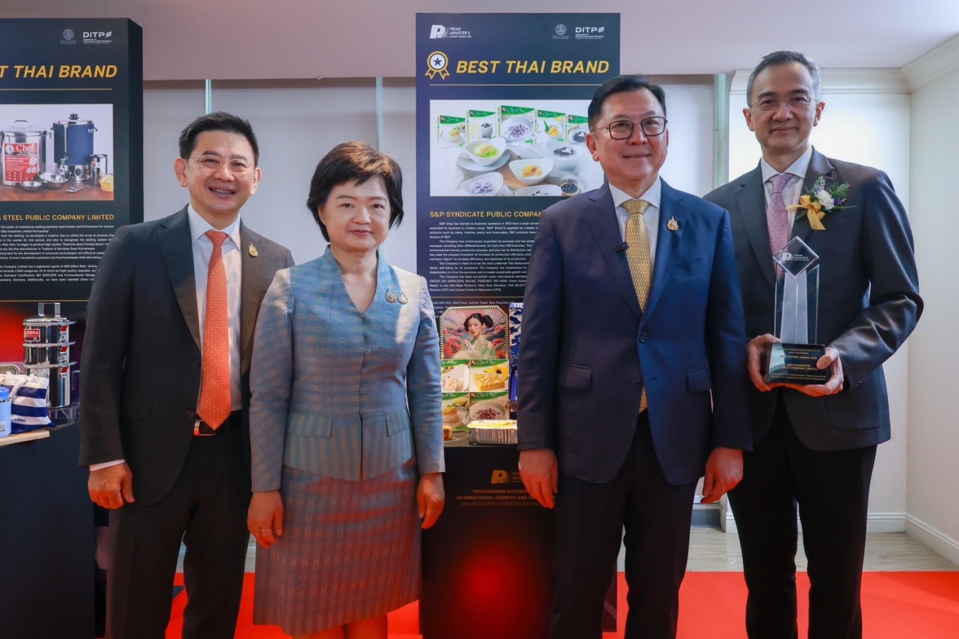 บริษัท เอส แอนด์ พี ซินดิเคท จำกัด (มหาชน) โดย คุณกำธร ศิลาอ่อน ประธานเจ้าหน้าที่บริหาร (ขวาสุด) รับมอบ รางวัลผู้ประกอบธุรกิจส่งออกดีเด่น ประจำปี 2568 (Prime Minister’s Export Award 2025) ประเภทรางวัลแบรนด์ไทยยอดเยี่ยม (Best Thai Brand) เพื่อเชิดชูผู้ประกอบการไทยที่มีผลงานด้านการส่งออกที่โดดเด่นและเป็นที่ยอมรับในระดับสากล ซึ่งจัดขึ้นเป็นปีที่ 33 ภายใต้แนวคิด “BRIDGE TO BRILLIANCE : Empowering Success Towards International Growth and Sustainability เสริมพลังความสำเร็จ สู่การเติบโตระดับนานาชาติอย่างยั่งยืน” โดยมี นายจตุพร บุรุษพัฒน์ รัฐมนตรีว่าการ กระทรวงพาณิชย์ (ที่ 2 จากขวา) เป็นประธานในพิธีมอบรางวัล พร้อมด้วย นางสาวสุนันทา กังวาลกุลกิจ อธิบดีกรมส่งเสริมการค้าระหว่างประเทศ (ที่ 2 จากซ้าย) จัดโดย กรมส่งเสริมการค้าระหว่างประเทศ กระทรวงพาณิชย์ ณ ห้องบุรฉัตร ไชยากร สำนักงานปลัดกระทรวงพาณิชย์ เมื่อเร็วนี้