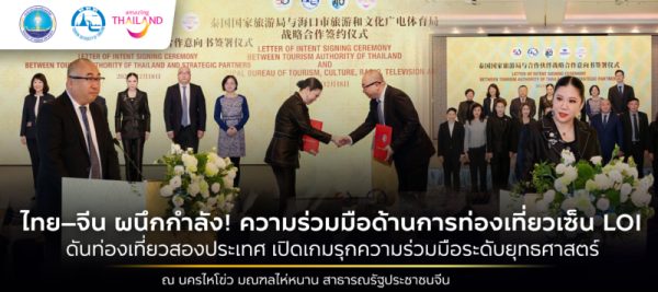 ททท. เชื่อมั่นว่าความร่วมมือครั้งนี้จะเป็นก้าวสำคัญในการขับเคลื่อนอุตสาหกรรมท่องเที่ยวของทั้งสองประเทศให้เติบโตอย่างมั่นคง ควบคู่กับการยกระดับมาตรฐานด้านความปลอดภัยและคุณภาพการท่องเที่ยว ภายใต้โครงการ Trusted Thailand พร้อมนำเสนอประสบการณ์ท่องเที่ยวรูปแบบใหม่ที่หลากหลาย คุ้มค่า และสร้างความเชื่อมั่น เพื่อเชิญชวนนักท่องเที่ยวชาวจีนเดินทางมาสัมผัสประเทศไทยด้วยรอยยิ้ม ความอบอุ่น และความประทับใจไม่รู้ลืม
