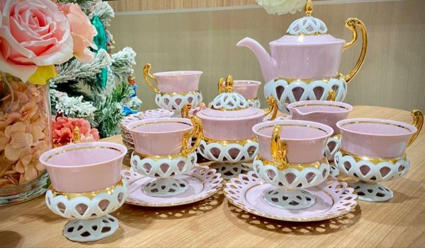 ชุดน้ำชาแอนธีคเนื้อพอร์ซเลนสีชมภูจากประเทศเชสโกสโลวาเกียบริจาคโดยกรรณิการ์ ศิลปวรางกูร ศิษย์เก่าและผู้มีอุปการะคุณของโรงพยาบาลธรรมศาสตร์ ฯลฯ