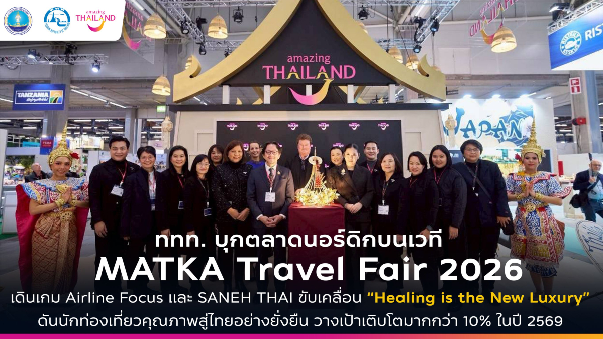การท่องเที่ยวแห่งประเทศไทย (ททท.) เดินหน้ารุกตลาดยุโรปตอนเหนือ ร่วมงาน MATKA Travel Fair 2026 ณ กรุงเฮลซิงกิ สาธารณรัฐฟินแลนด์ ระหว่างวันที่ 15–18 มกราคม 2569 ตอกย้ำบทบาทประเทศไทยในฐานะจุดหมายปลายทางระดับพรีเมียมของนักท่องเที่ยวนอร์ดิก ด้วยการผสาน SANEH THAI และ Airline Focus Strategy และแนวคิดการท่องเที่ยวเชิงคุณค่าอย่างเป็นรูปธรรม